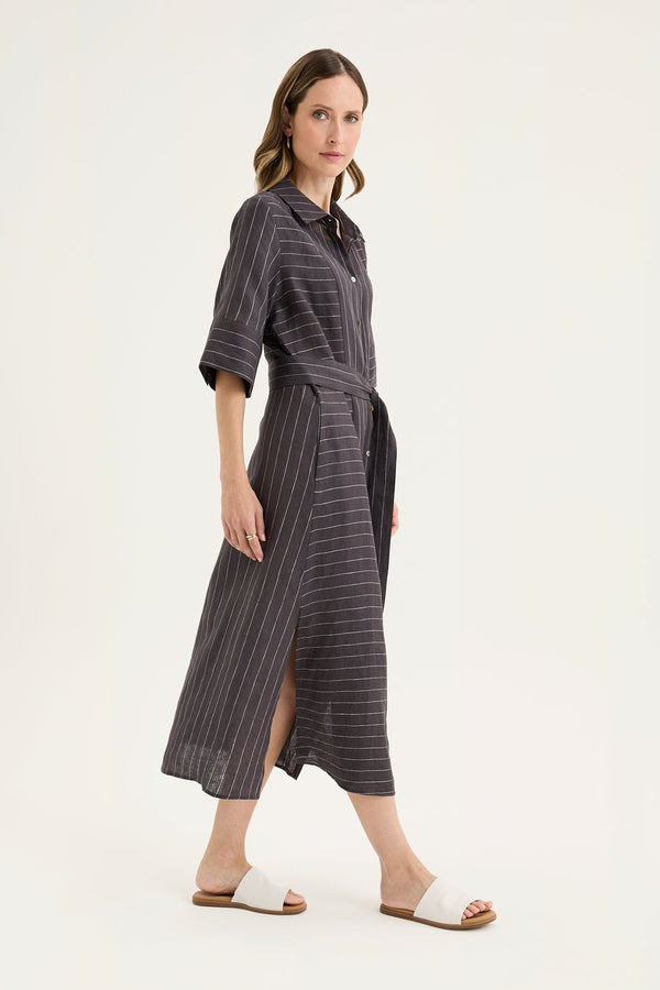 The Phoenix Dress is a modern interpretation of the shirt dress, designed with both structure and ease in mind. Cut from a linen-cotton blend in a charcoal-brown yarn-dyed stripe, the fabric is panelled in contrasting directions to create subtle dimension and visual interest. A button-through placket runs nearly the full length, allowing you to wear it open as a light summer layer or closed for a clean, elongated line. The 3/4 sleeves finish with wide hem bands, balancing the relaxed silhouette, while a matching fabric tie belt gives the option of shaping the waist. High side splits and a midi length that falls just above the ankle keep the dress feeling light and summery, complemented by functional side pockets for everyday ease. Effortless yet refined, this is a shirt dress designed to stand apart in both craftsmanship and wearability.