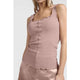 This stylish singlet is made from a soft, stretchy ribbed fabric and features playful wavy edges along the neckline, straps, and hem. The square neckline adds a modern and feminine touch. Perfect to wear on its own or layered under a blouse or cardigan. The model is 178 cm and wears size S.