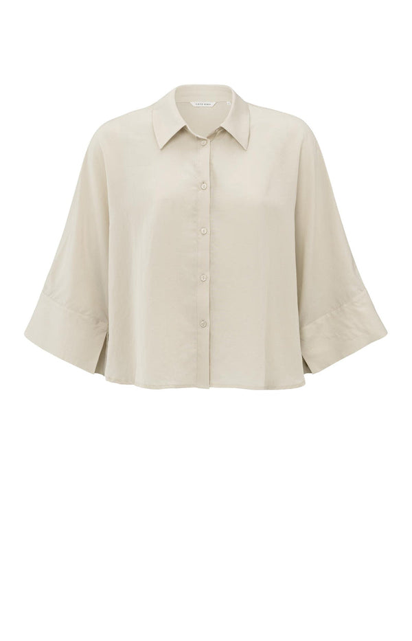This airy blouse features a cropped, loose fit and is made from a soft, flowy fabric for a comfortable look. It is designed with a classic collar, a button-down front, and three-quarter sleeves with wide cuffs. Perfect to pair with high-waisted trousers or a skirt for a stylish look. The model is 173 cm and wears size 36.
